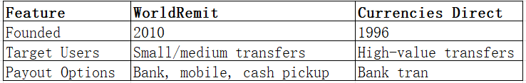 In summary, WorldRemit vs Currencies Direct illustrates the differences between fast, flexible small transfers and high-value, personalized options. WorldRemit is suitable for quick, smaller transfers, while Currencies Direct caters to larger sums with tailored service. Panda Remit provides a competitive alternative, featuring: