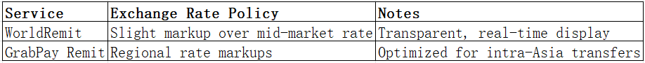 GrabPay Remit typically offers competitive rates within Asia but may apply slightly higher markups compared to WorldRemit for certain corridors. Rate variations depend on local partnerships and payment channels.