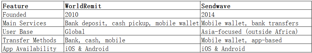 Transfer Methods: WorldRemit supports bank deposits, cash pickup, and mobile wallet; Sendwave emphasizes mobile wallet and app-based transfers.