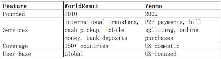 Differences: WorldRemit targets international remittances, whereas Venmo focuses on domestic peer-to-peer payments. WorldRemit provides multiple payout methods; Venmo is limited in its global transfer capabilities.