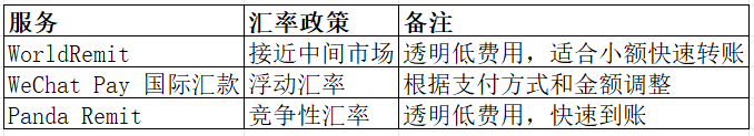WorldRemit按金额收取透明费用,适合小额汇款。WeChat Pay国际汇款费用可能浮动,具体取决于汇款金额、目的地及支付方式。