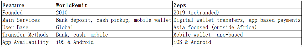 Transfer Methods: WorldRemit supports bank deposits, cash pickups, and mobile wallets; Zepz focuses on digital wallet and app-based transfers.