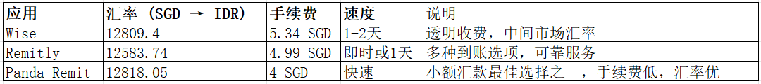 印度尼西亚是许多新加坡工作者和家庭的资金接收地。无论是支持家人、支付学费还是日常开销,小额汇款都很常见。选择低费用和高汇率的汇款服务可以让每一笔钱更有价值。Panda Remit、Wise和Remitly提供快速、可靠且便捷的数字汇款服务,确保资金及时到达接收方账户。