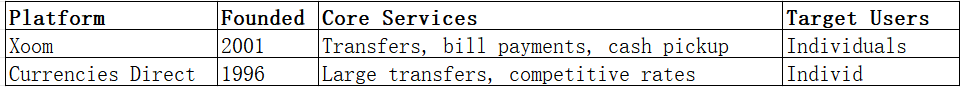 Target Audience: Xoom for individuals; Currencies Direct for businesses and high-value personal transfers