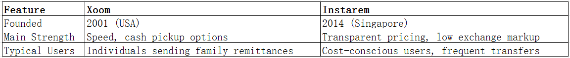 Xoom tends to focus on speed and payout flexibility (e.g., cash pickup), while Instarem emphasizes cost efficiency and transparency.