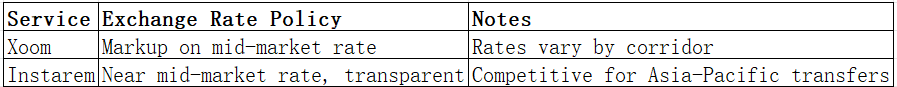 Exchange rate markups can significantly affect the final amount received. Xoom often applies a markup above the mid-market rate. Instarem is known for offering rates closer to the mid-market rate with minimal markup.