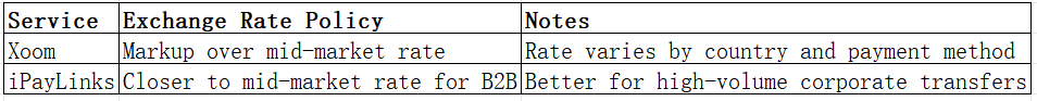 Exchange rate markups are a significant cost factor. Xoom usually applies a margin over the mid-market rate, which can vary by corridor. iPayLinks tends to offer rates closer to the mid-market for B2B transfers.