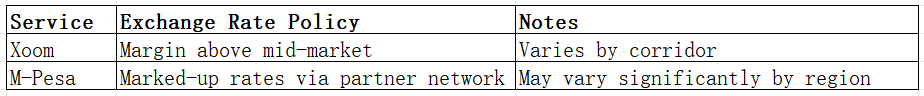Xoom usually applies a margin above the mid-market exchange rate, which can impact the total amount received by the recipient. M-Pesa also uses marked-up rates, and rates may fluctuate depending on the partner network.