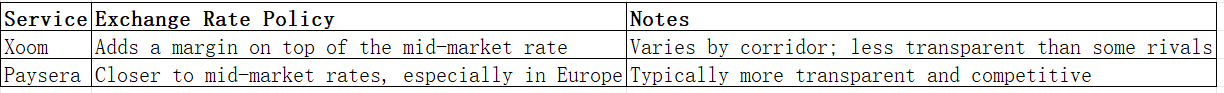 Xoom often applies a markup to the mid-market rate, which can reduce the final amount received. Paysera tends to offer better rates for Euro transfers.