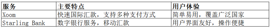 Xoom 支持即时到数分钟到账的快汇,移动应用使用方便,支付方式多样。Starling Bank 提供实时账户管理和跨境支付,操作流畅,集成多种数字化功能。