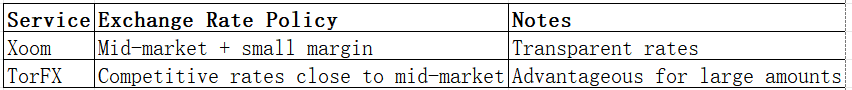 Fees: Xoom suits small transfers; TorFX is optimized for larger transfers with lower fees per transfer