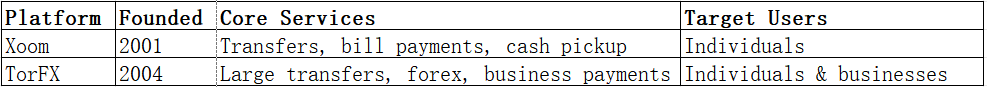 Target Audience: Xoom targets individuals; TorFX caters to businesses and high-value personal transfers