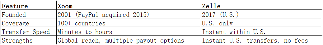 Xoom is widely used for international transfers, supporting bank deposits, mobile wallets, and cash pickup. Zelle is a U.S.-based platform specializing in instant domestic transfers between participating banks.