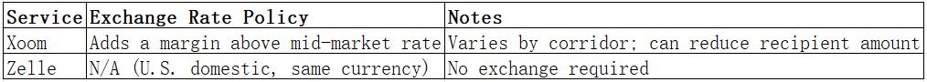 Xoom applies markups on international transfers, while Zelle transfers remain in USD. Panda Remit typically offers competitive exchange rates for international corridors.
