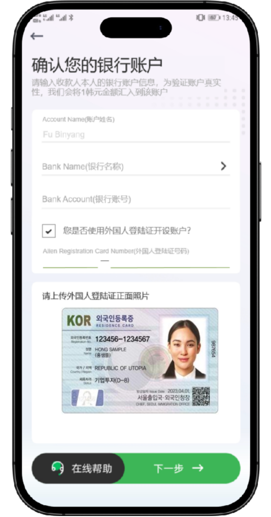 2)上传收款人证件,并确保照片清晰且不反光(韩国籍用户需上传韩国身份证,非韩国籍用户上传护照);
