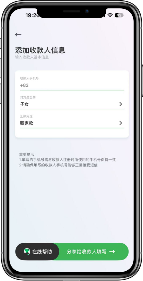 填写收款人手机号👉选择收汇款人关系👉填写汇款用途👉点击【分享给收款人填写】