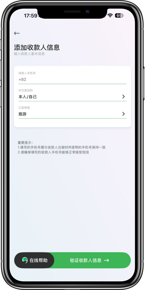 填写手机号👉选择收汇款人关系👉填写汇款用途👉点击【验证收款人信息】