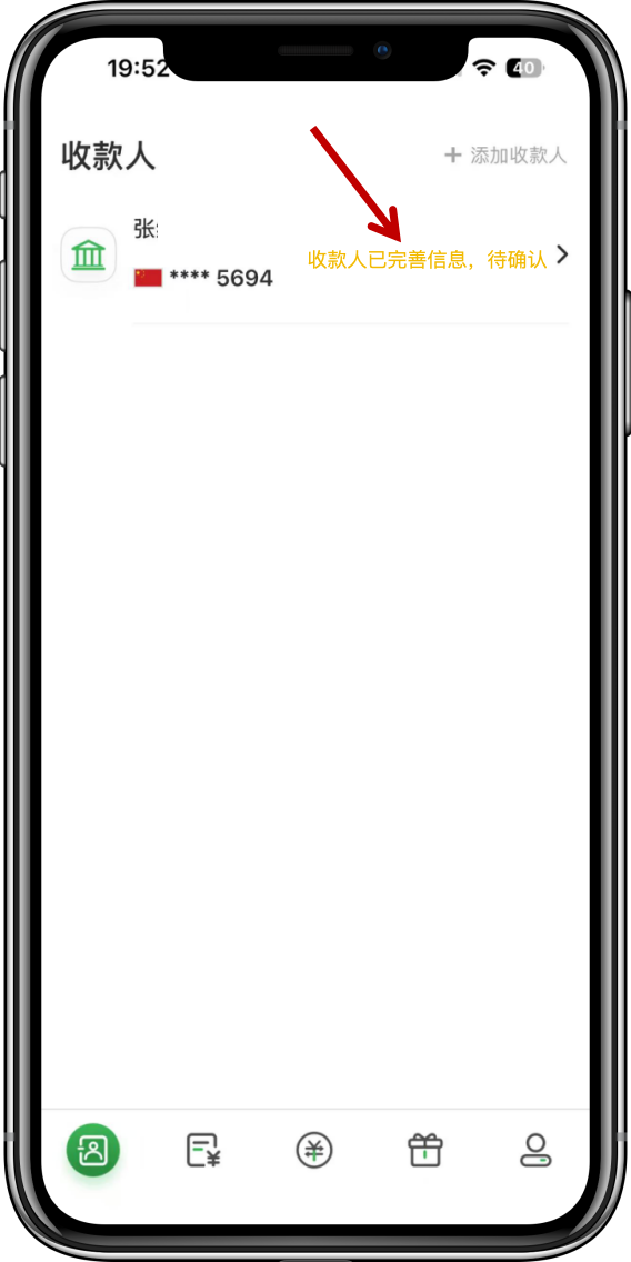 1)收款人审核通过后,汇款人APP会展示该收款人,并标记“收款人已完善信息,待确认”;