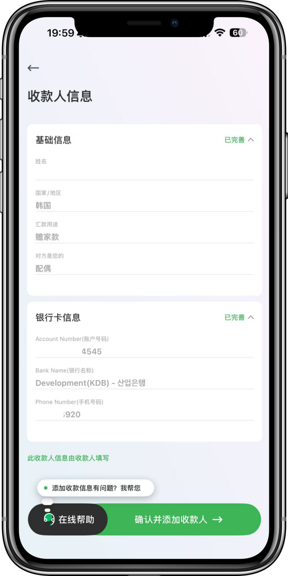 2)汇款人点击进入收款人信息详情页面 点击【确认并添加收款人】,则收款人添加成功;